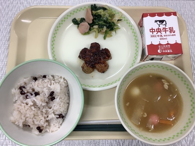 今日は、中学校3年生の卒業お祝い献立です。赤飯や花の形のハンバーグ、桜の形の かまぼこが入った ごまあえ、紅と白の団子が入った すまし汁で卒業を お祝いします。ところでみなさんは、給食で赤飯がでる時は いつなのか知っていますか。正解は、卒業のお祝いの時と、入学や進級のお祝いの時です。お祝いの時に赤飯を食べるのは、赤飯の赤い色が、悪いものを避ける力があると いわれているからです。赤飯を残さず食べたら、きっと どこかで みなさんを守ってくれますよ。