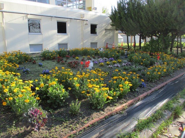 4月16日(木)、昨日は雨でしたが、今日はとってもよい天気です。学校のメイン花壇には、美しく花が咲いています。来週の授業参観日に、ぜひご覧ください。