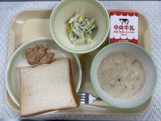 4~6月は、ワールドカップ開催国の料理を集めた献立を提供します。4月は、ワールドカップが行われる国の一つ「アメリカ合衆国」に関係のある料理をそろえました。「鶏肉のバーベキューソース」にかかっているバーベキューソースは、アメリカの南の方でよく使われるソースで、肉の味つけなどに使われる甘酸っぱいソースです。シーザーサラダは、メキシコから伝わり、アメリカでもよく食べられているサラダです。チーズが入ったサラダですが、今日は給食用にアレンジして、チーズを使わず作りました。クラムチャウダーは、アメリカの東の方で生まれたあさりなどの貝を入れ、牛乳を使った白いスープです。今日の給食では、牛乳の代わりに豆乳を使って作りました。来月の応援献立も楽しみにしていてください。