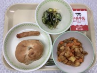 今日は、今がおいしい大根を ごまあえにしました。ごまあえの中に、緑色の野菜が入っていると思います。何の野菜か分かりますか。答えは、小松菜です。小松菜は、ほうれん草と色や形が似ています。みなさんは、見分けることができますか?葉の形や茎の太さ、根の色の違いで見分けることが できるので、スーパーの野菜売り場で比べてみてください。