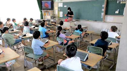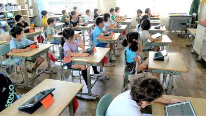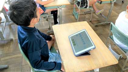 先生はタブレットで赤白帽子の写真をとりました。そして、とった写真を使って、生き物ものをつくりました。さあ、みんなも先生に続いて・・・。