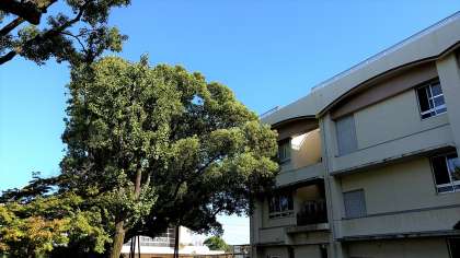 メイン花壇の花、クスノキと1棟の校舎、池の鯉です。学校には、ビオトープの水を求めて、たくさんの鳥や虫が集まってきます。