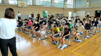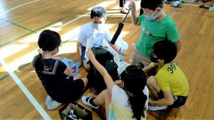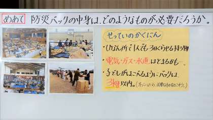 「ひなん所で1人でも3日くらせる持ち物」、「子どもがはこべるようにバックは3kg以内」などの設定で、防災バックに入れる物を話し合いました。決まった物はリュックに入れ、体重計で重さを計りました。
