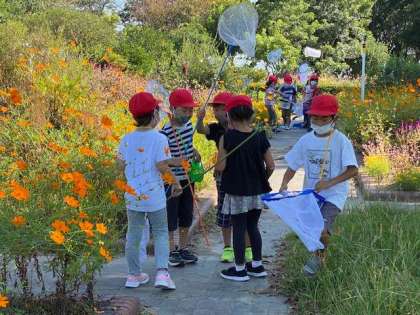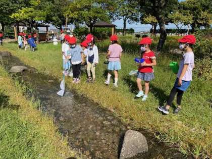 水源公園へ、虫とりに行きました。ショウリョウバッタやアマガエルやモンキチョウなど、たくさんの生き物を見つけました。また、季節の植物もたくさん見つけました。これから学校で、見つけた生き物についてまとめていきます。