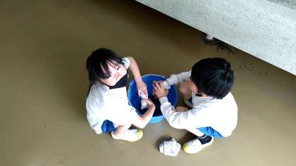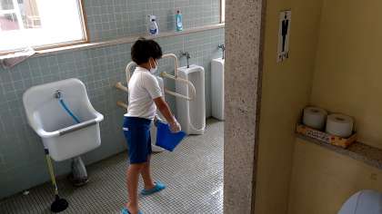 整理整頓をしている子、ぞうきんをしぼっている子、みんな、がんばっています。