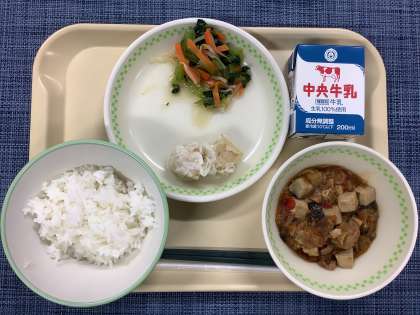 今日はなすをたっぷり使った「マーボーなす」でした。日本のナスは、ほとんどが黒紫色ですが、白色や緑色、しま模様のものもあります。今日は幸田町産のなすでした。