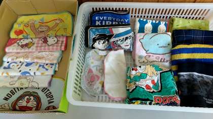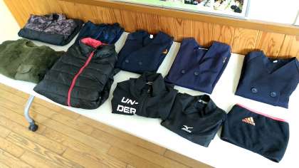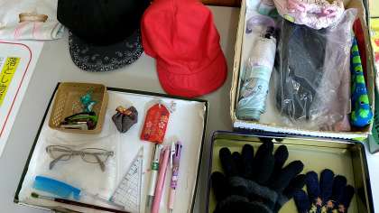 職員室前に展示してあります。自分のものがあったら、近くの先生に知らせてください。持ち主に戻りますように。