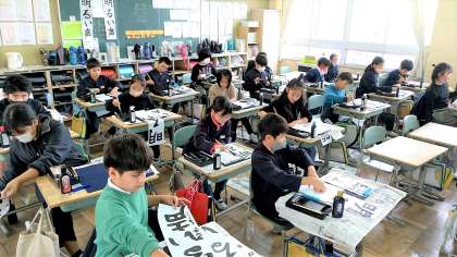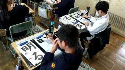 書き初めは、日本の年中行事の一つで、新年になって初めて毛筆で字や絵を書くことを指すようです。みんな、集中しています。