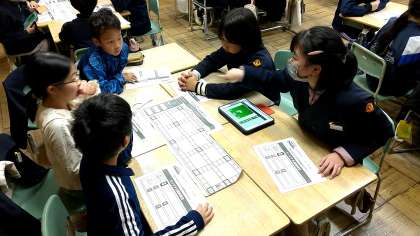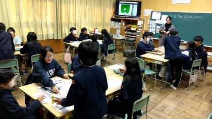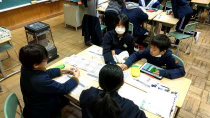 社会の時間に「鷲鉄すごろく」を作って遊びました。アプリのサイコロですすむコマの数を決め、日本全国いろいろなところに行きました。とても盛り上っていました。