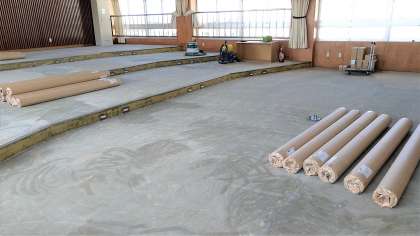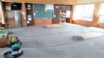 3棟3階の音楽室を改修中です。床のじゅうたんをはがし、フローリングをします。これで、シューズを脱がなくても、音楽室に入ることができるようになります。