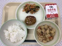 ★☆★ 今日の献立 ★☆★ご飯 牛乳ハンバーグのきのこあんかけ高野豆腐の煮物にん...